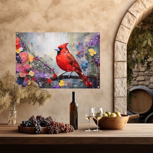 Schilderij: Rode kardinaal, bloemen tuinposter
