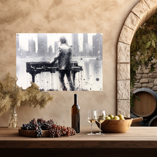 Pianist tegen de achtergrond van een wazige stad tuinposter