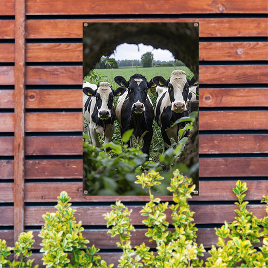 Drie zwart-wit koeien staren nieuwsgierig tuinposter