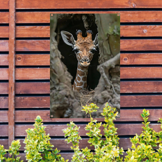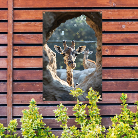 Zwart-Wit Portret van Nieuwsgierige Giraffe tuinposter