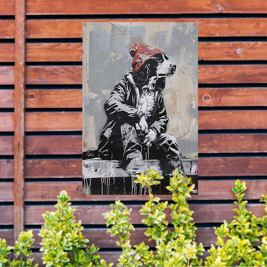 Zwart-witte hond met rode muts op betonnen richel tuinposter