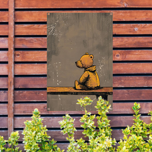 Eenzame Teddybeer op Bankje in Verlaten Landschap tuinposter