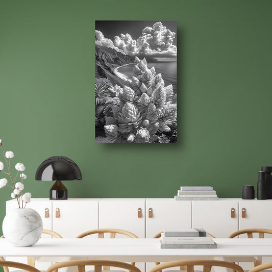 Zwart-wit kustlandschap met bloeiende planten canvas