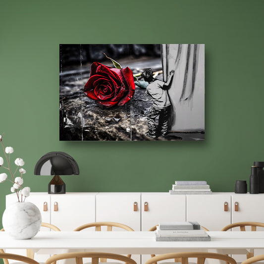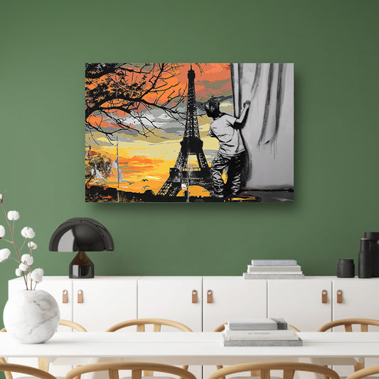 Jongen kijkt naar Eiffeltoren bij zonsondergang canvas