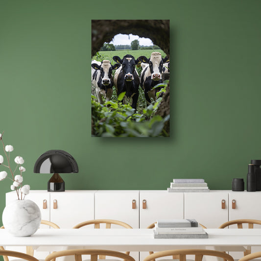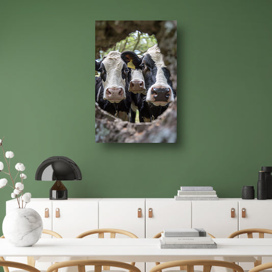 Twee nieuwsgierige koeien gluren door boom acrylglas
