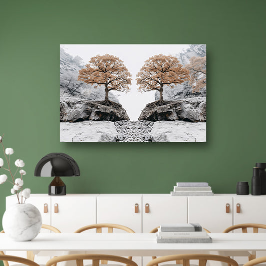 Symmetrische bomen boven rotsachtige kloof acrylglas