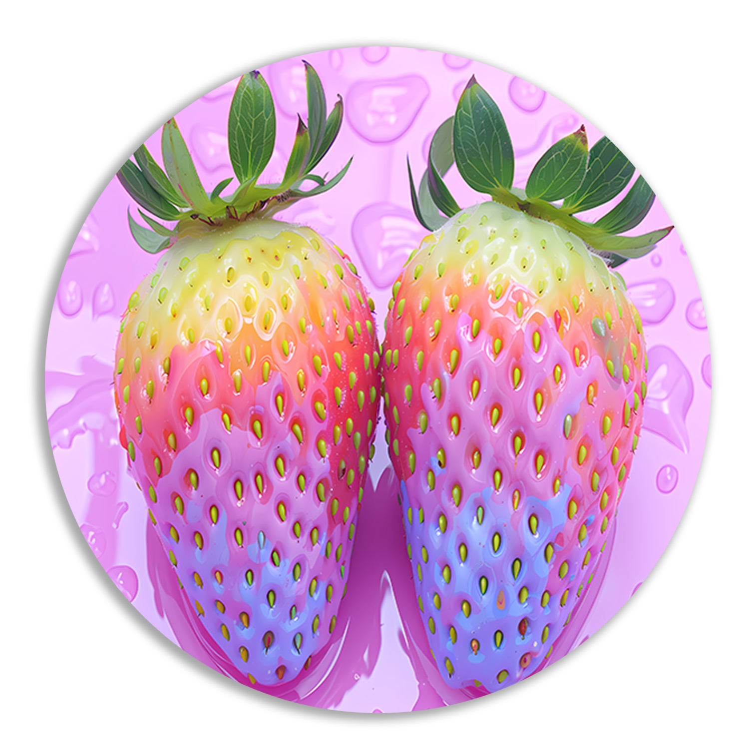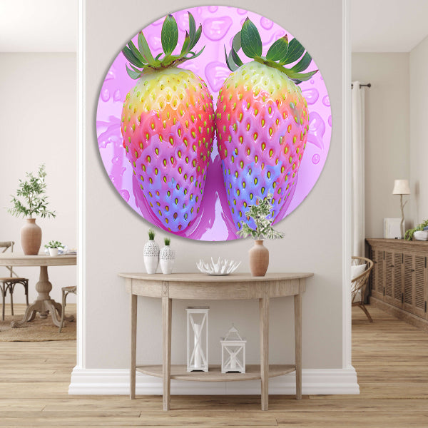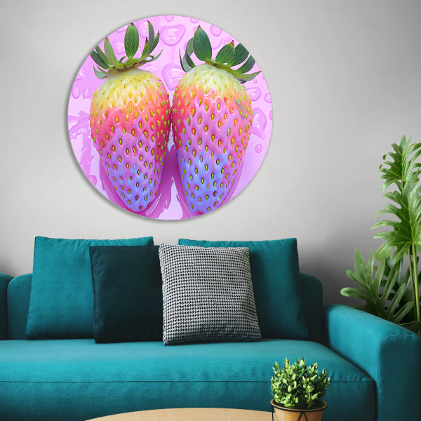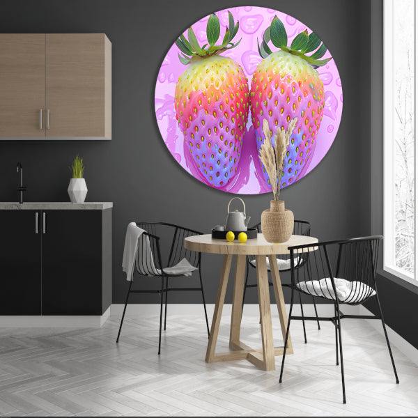 De muurcirkel is gemaakt van hoogwaardig 3 mm aluminium, wat zorgt voor een strak en modern uiterlijk. De afbeelding van de abstracte aardbeien op de roze achtergrond is gedrukt met hoge resolutie en levendige kleuren, wat zorgt voor een eyecatching element in je interieur.