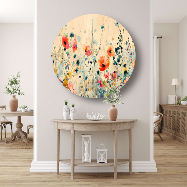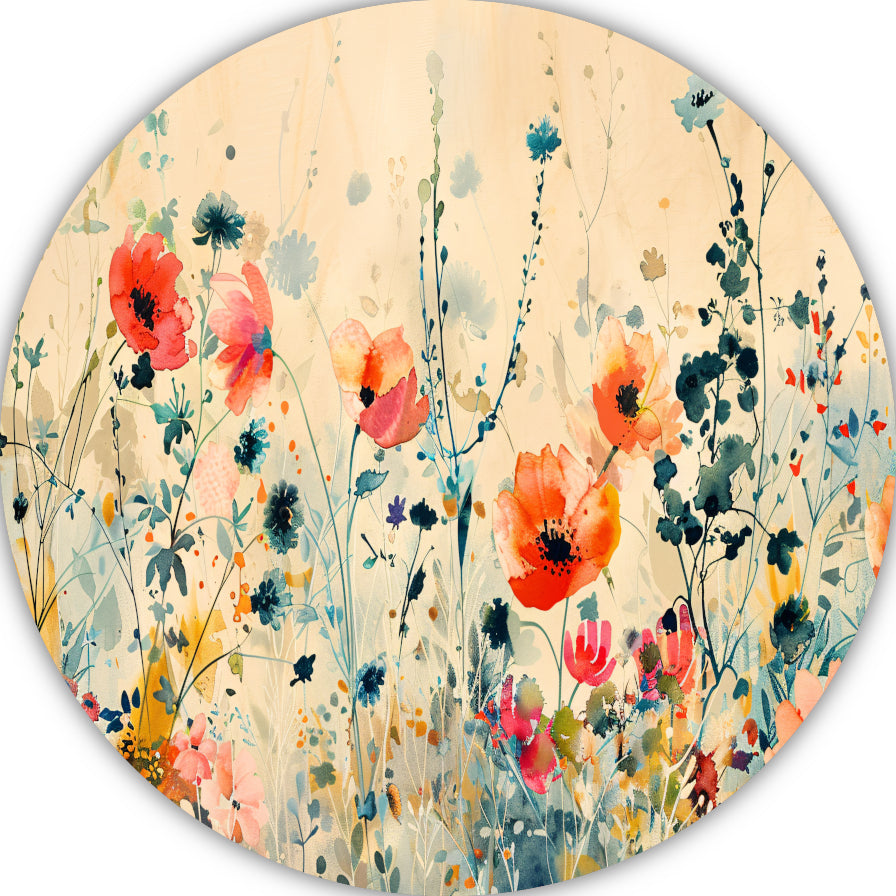 Breng kleur en leven in jouw interieur met dit prachtige Abstract aquarel schilderij van kleurrijke wilde bloemen op een aluminium muurcirkel!