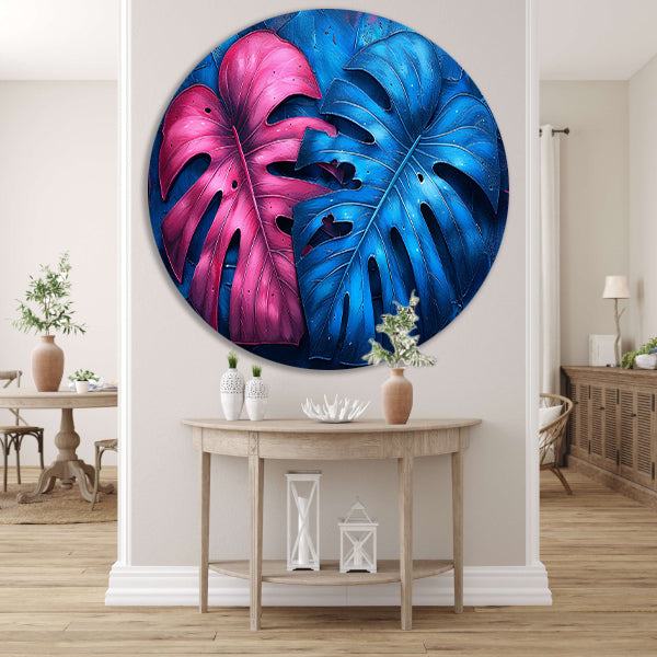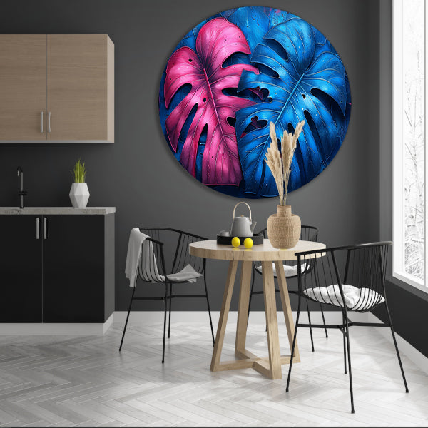 Abstract bladeren in roze en blauw aluminium muurcirkel