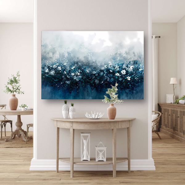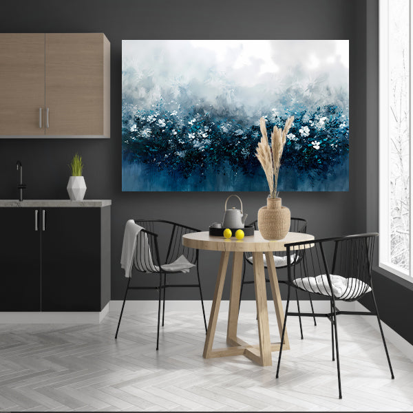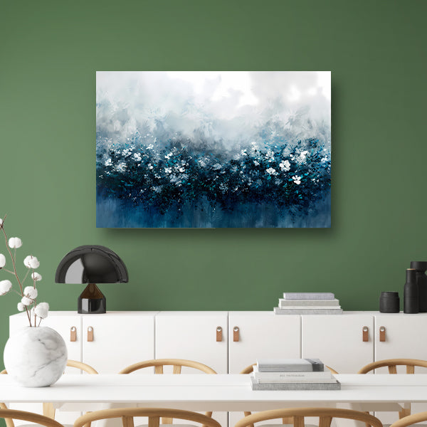 Abstract bloemenveld in blauwe tinten canvas met baklijst