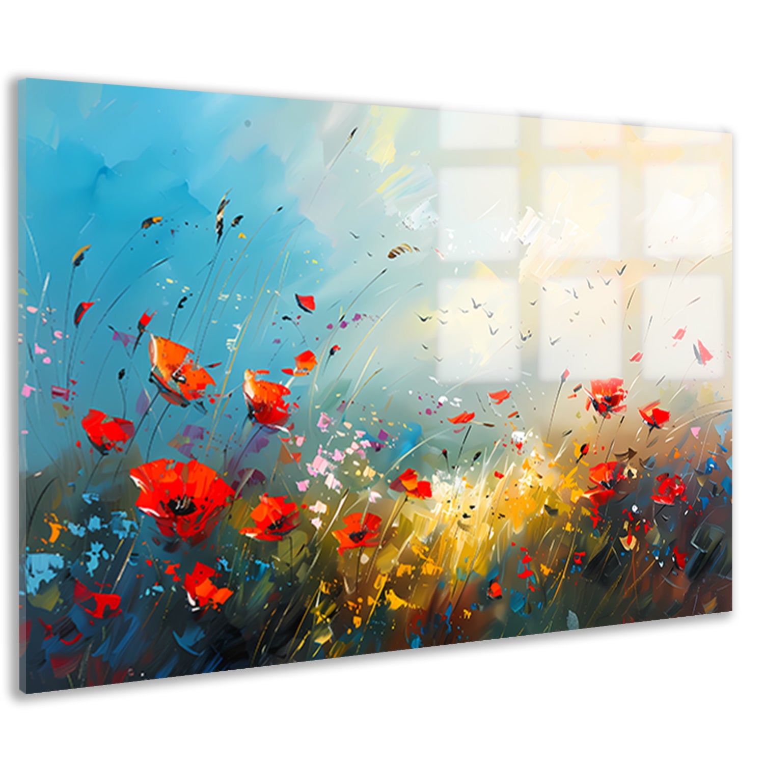 Abstract bloemenveld met felle kleuren en vogels acrylglas