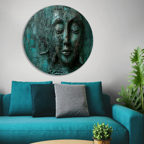 Abstract boeddha schilderij met rijke textuur aluminium muurcirkel