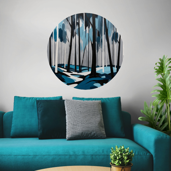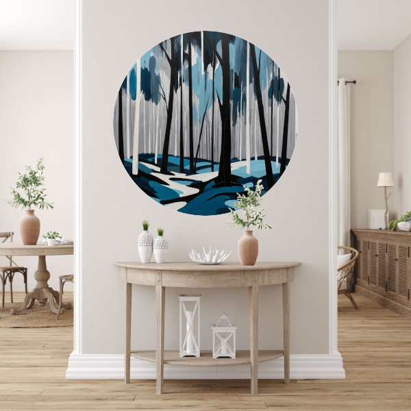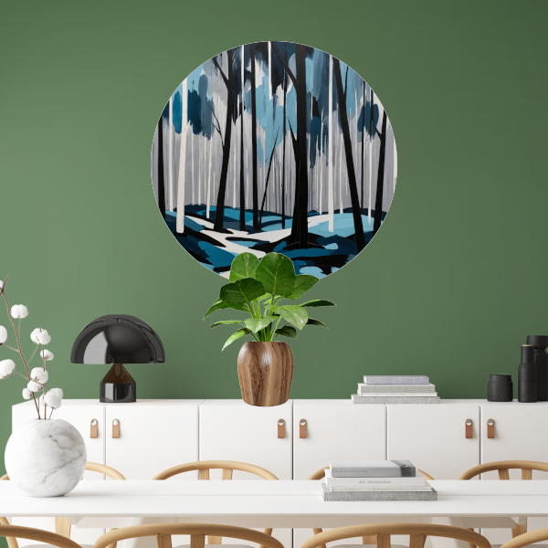 Met deze abstracte boslandschap muurcirkel haal je een stukje natuur en kunst in huis, en creëer je een kalme en ontspannen sfeer. Bestel vandaag nog en geniet van de schoonheid van de natuur aan je muur!