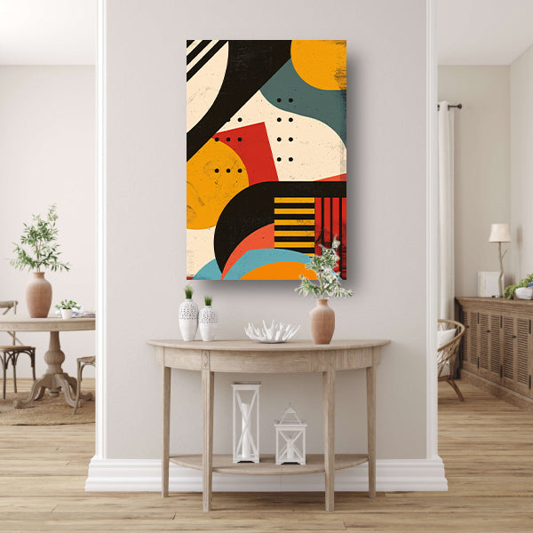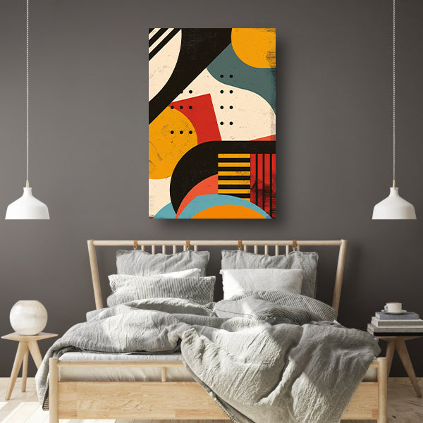 Abstract compositie met geometrische vormen en primaire kleuren canvas met baklijst