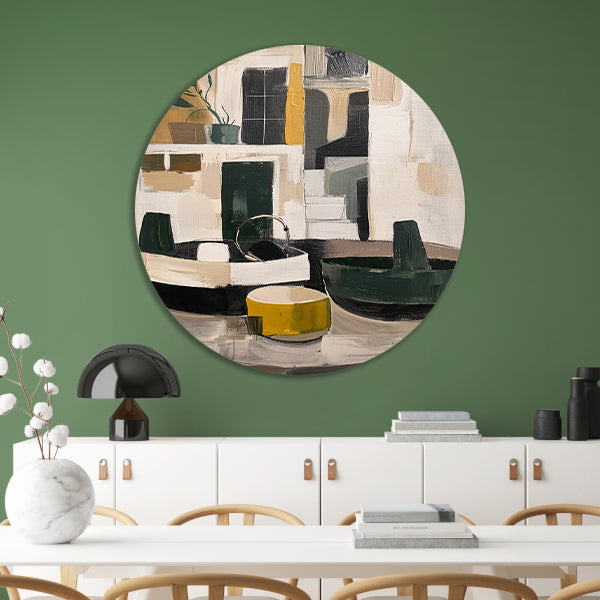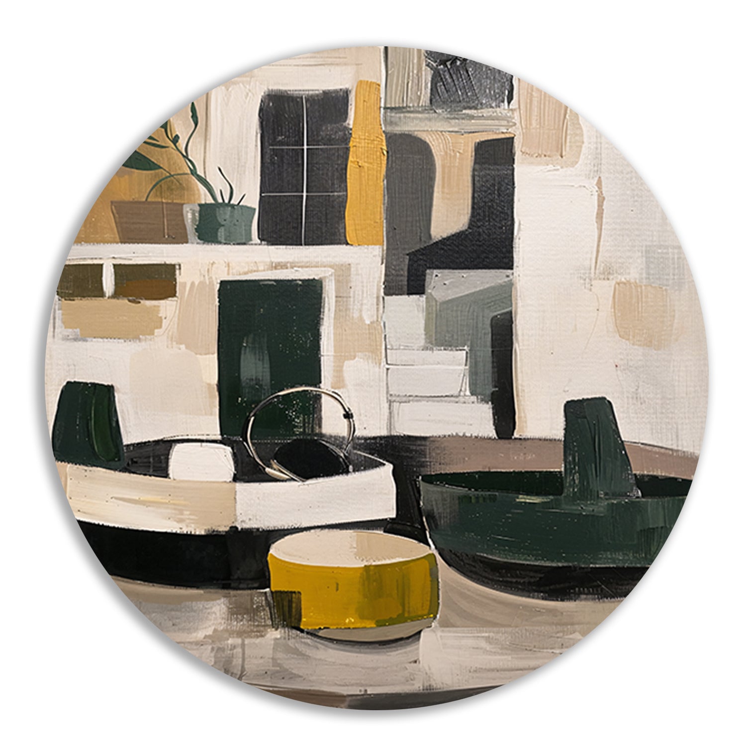 Abstract compositie met vaas en plant aluminium muurcirkel
