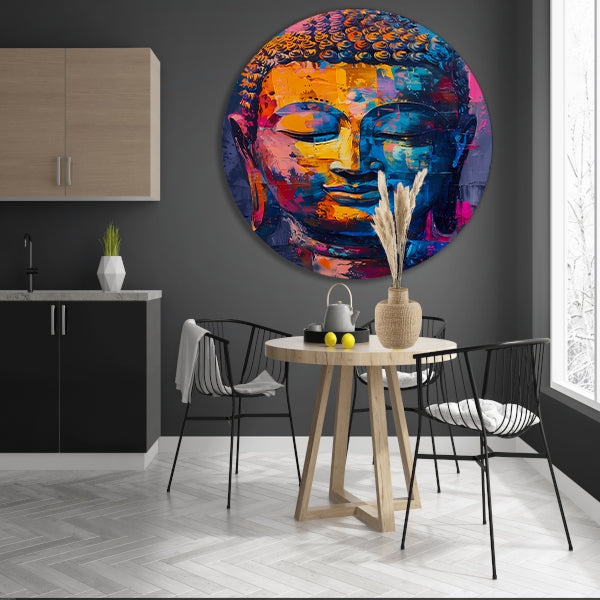 Abstract en kleurrijk Boeddha hoofd schilderij aluminium muurcirkel
