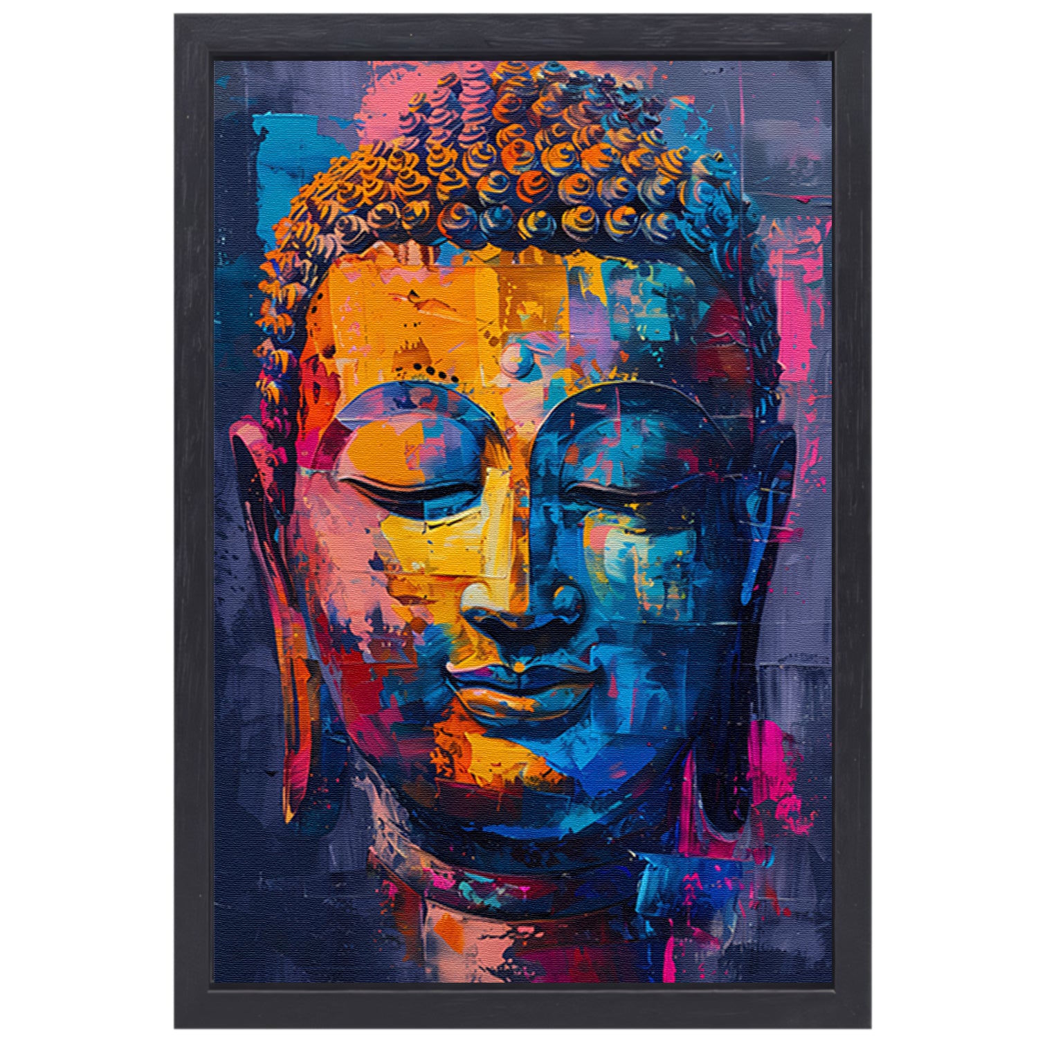 Abstract en kleurrijk Boeddha hoofd schilderij canvas met baklijst
