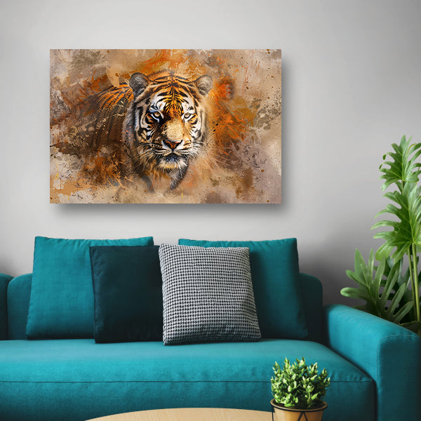 Abstract expressief tijgerportret in oranje tinten canvas met baklijst