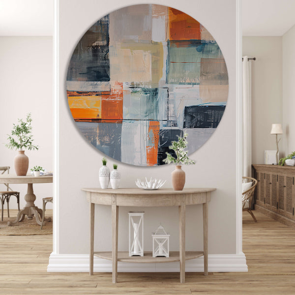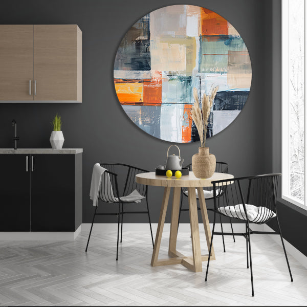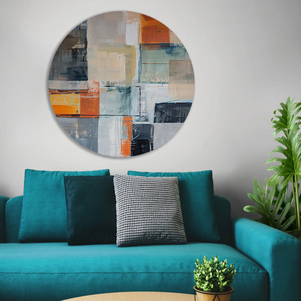 Abstract geometrisch schilderij met vierkanten en kleuren aluminium muurcirkel
