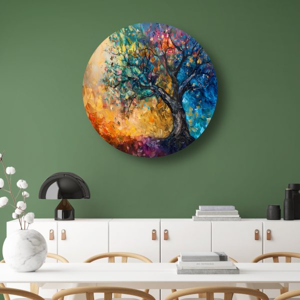 De levendige kleuren en abstracte vormen van de boom zorgen voor een opvallend en kunstzinnig accent in elke ruimte. Of je nu op zoek bent naar een eyecatcher voor je woonkamer, slaapkamer of kantoor, deze muurcirkel zal zeker de aandacht trekken en een stijlvolle touch toevoegen aan je interieur.