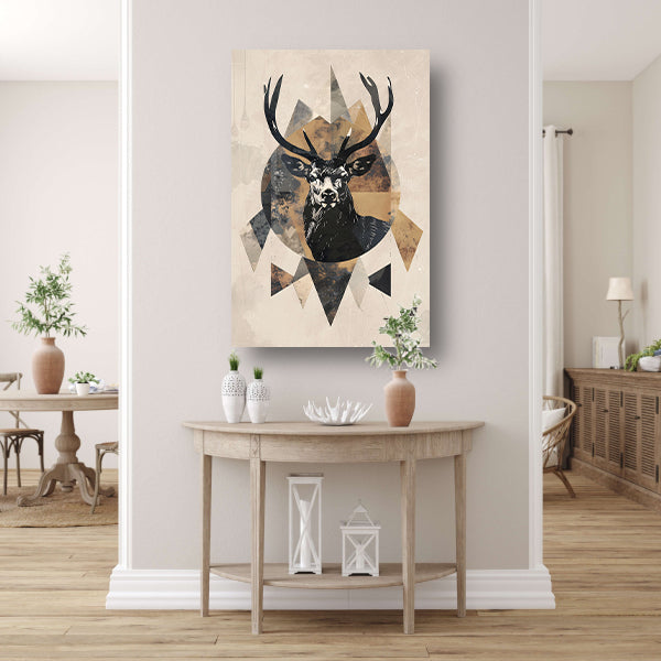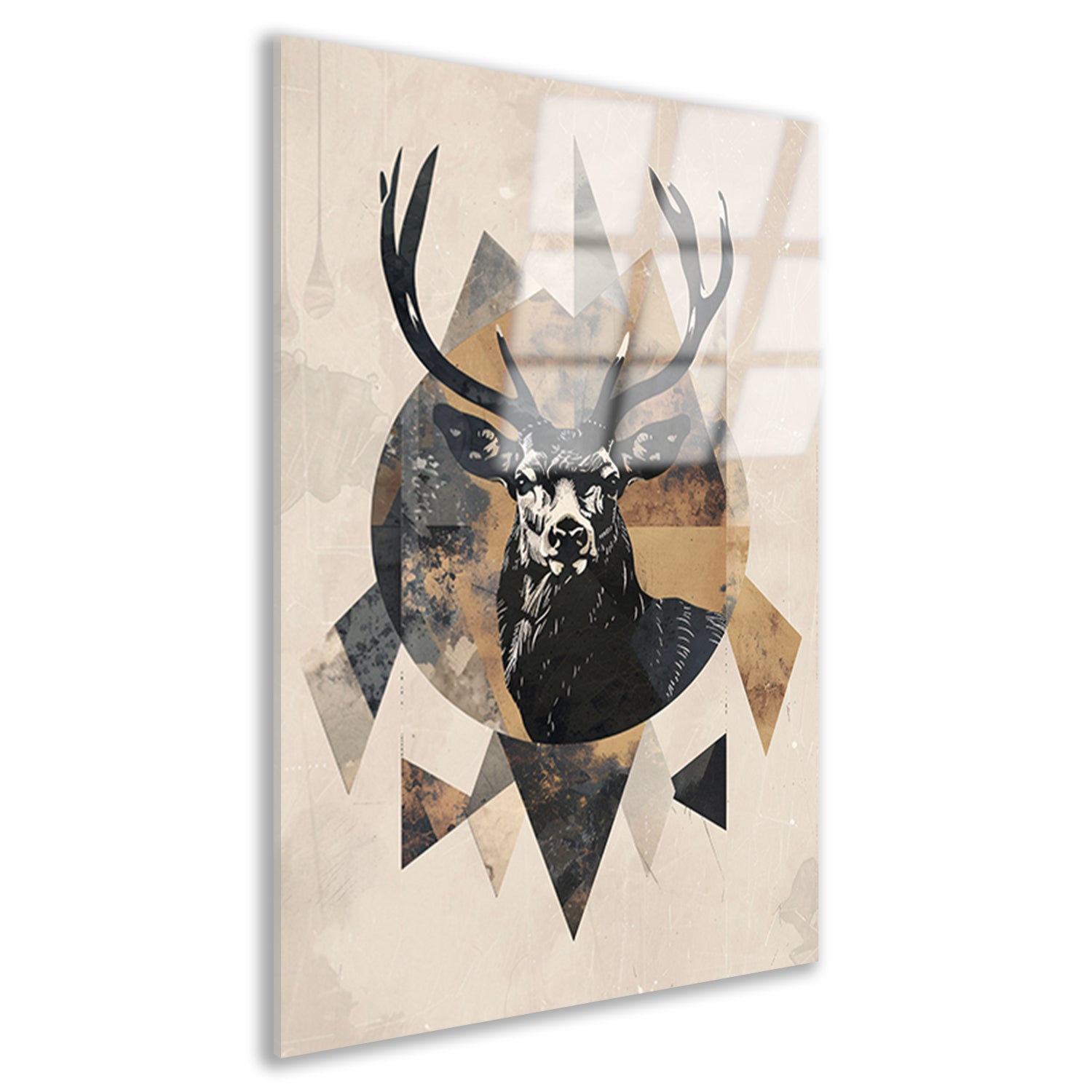 Breng de natuur naar binnen met dit prachtige abstracte hert in geometrische sepia tinten op acrylglas en laat je ruimte stralen met dit unieke kunstwerk.