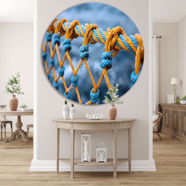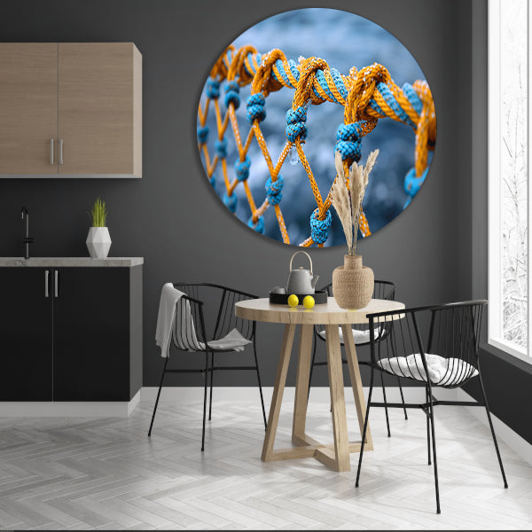 De blauwe en gele kleuren zorgen voor een levendige en opvallende uitstraling, waardoor deze muurcirkel een echte eyecatcher is in elke ruimte. Of je nu van abstracte kunst houdt of gewoon op zoek bent naar een uniek accent voor je interieur, deze muurcirkel zal zeker indruk maken.