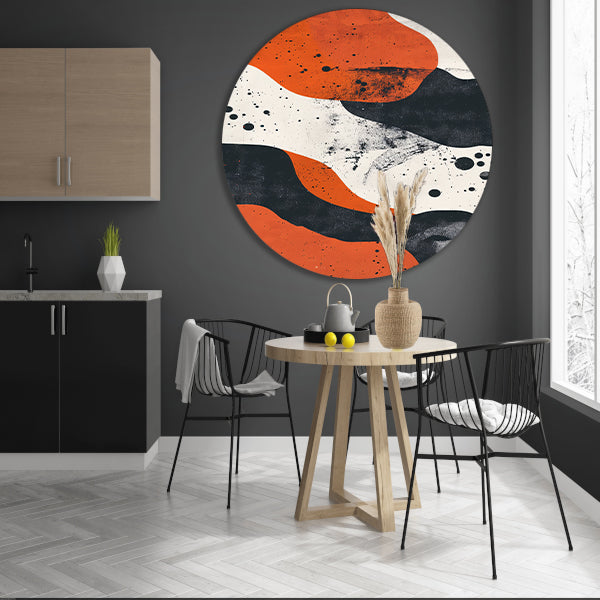 Met deze Abstracte muurcirkel met oranje en zwart aluminium haal je een stukje moderne kunst in huis dat jouw stijlvolle smaak perfect weerspiegelt.