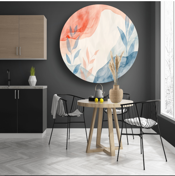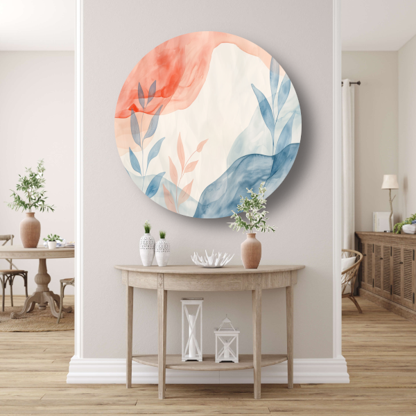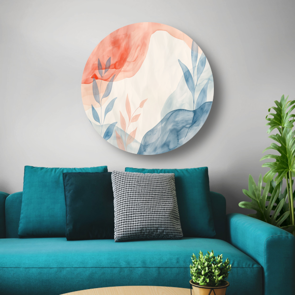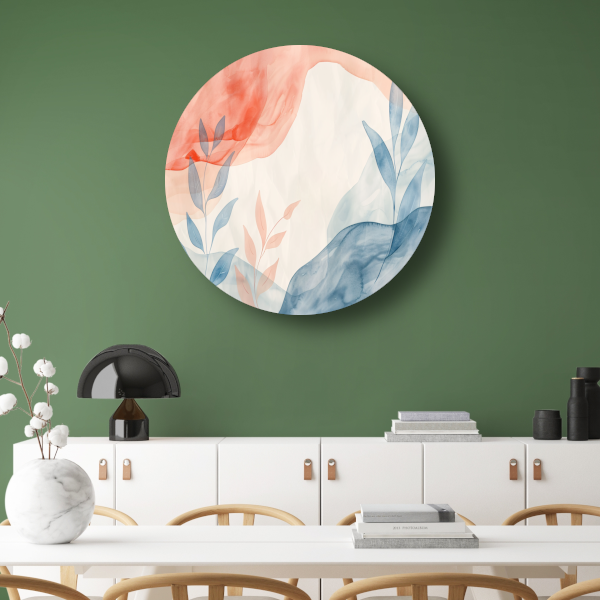 De kleuren spatten van het doek af en brengen de natuur op een abstracte manier tot leven. Dankzij de aquarel techniek lijkt het bijna alsof je een echt kunstwerk aan de muur hebt hangen. De cirkelvorm zorgt voor een speels effect en past goed in verschillende interieurstijlen.