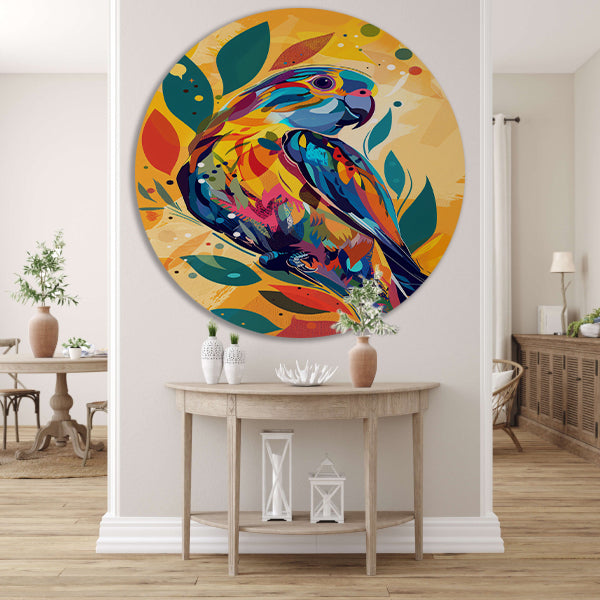 De speelse compositie van de abstracte papegaai en de weelderige junglekleuren zorgen voor een vrolijke en exotische uitstraling in elke ruimte. Of je nu een tropisch element wilt toevoegen aan je woonkamer, slaapkamer of kantoor, deze muurcirkel is een echte blikvanger.