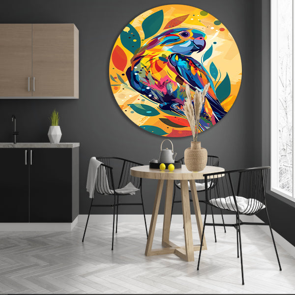 De Abstract Papegaai in Kleurrijk Jungle aluminium muurcirkel is verkrijgbaar in allerlei formaten, waardoor je hem perfect kunt afstemmen op de beschikbare ruimte. Kies voor een klein formaat als eyecatcher in een collage van kunstwerken, of ga voor een groter formaat om een statement te maken in een lege wand.