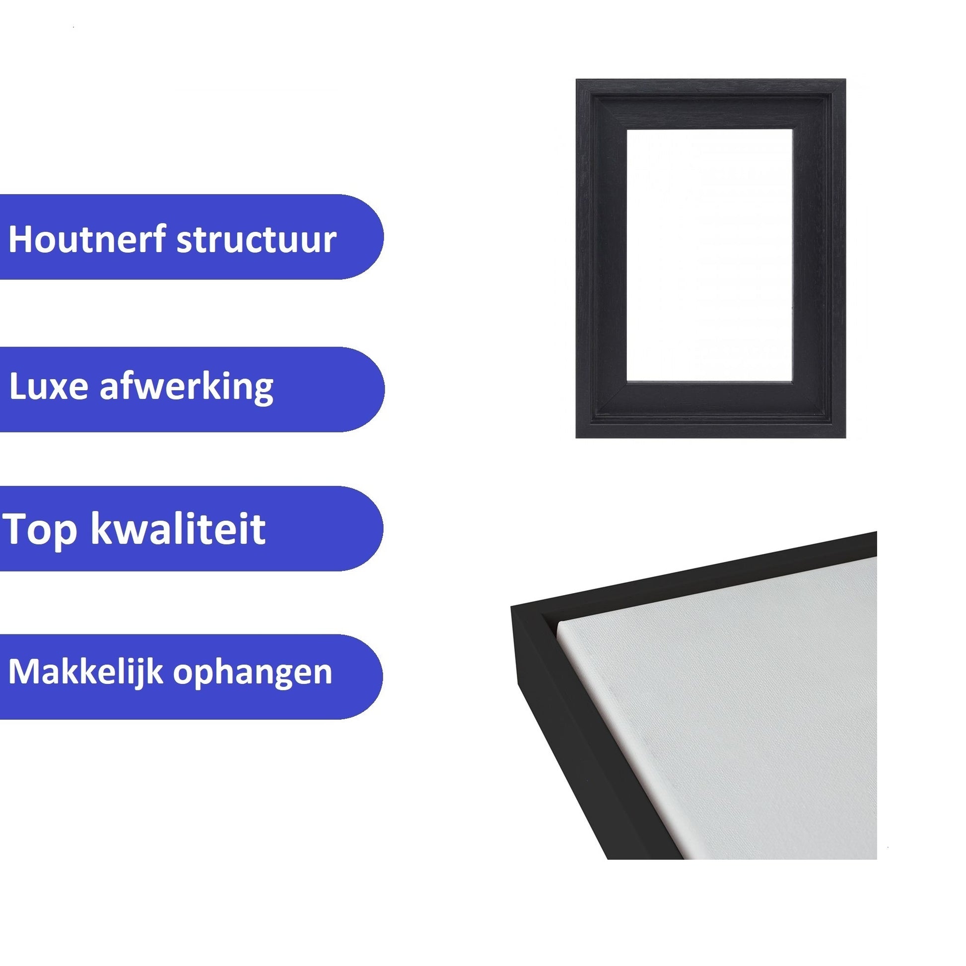 Een canvas met baklijst geeft je interieur een luxe en afgewerkte uitstraling. Onze baklijsten zijn gemaakt van hoogwaardig hout en verkrijgbaar in zwart met een zichtbare houtnerfstructuur, wat een moderne en elegante look biedt. De lijst heeft een framedikte van 3,5 cm. De montage van het canvas in de baklijst en aan de muur is eenvoudig.