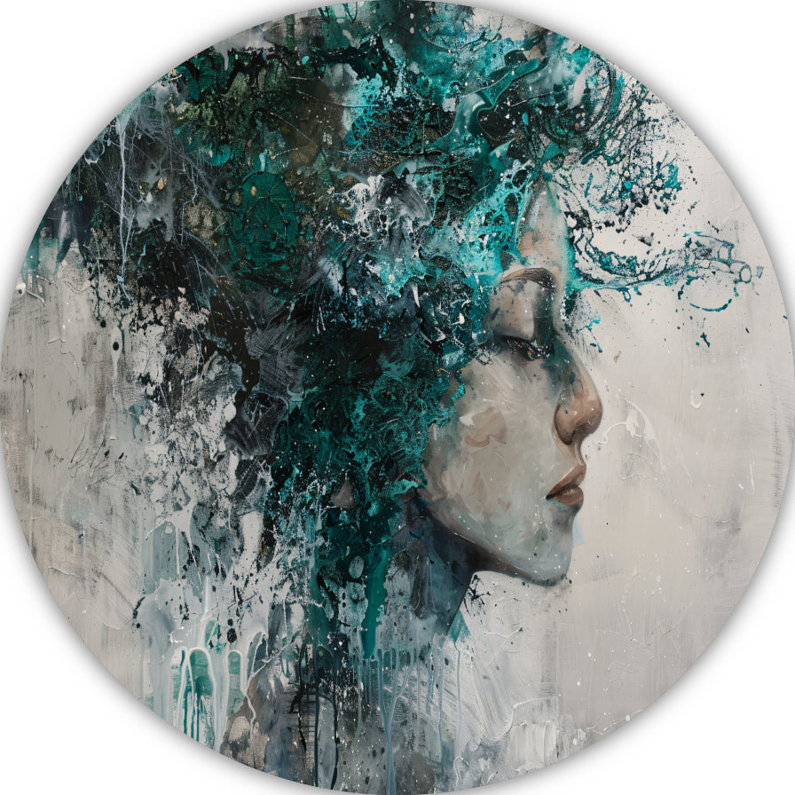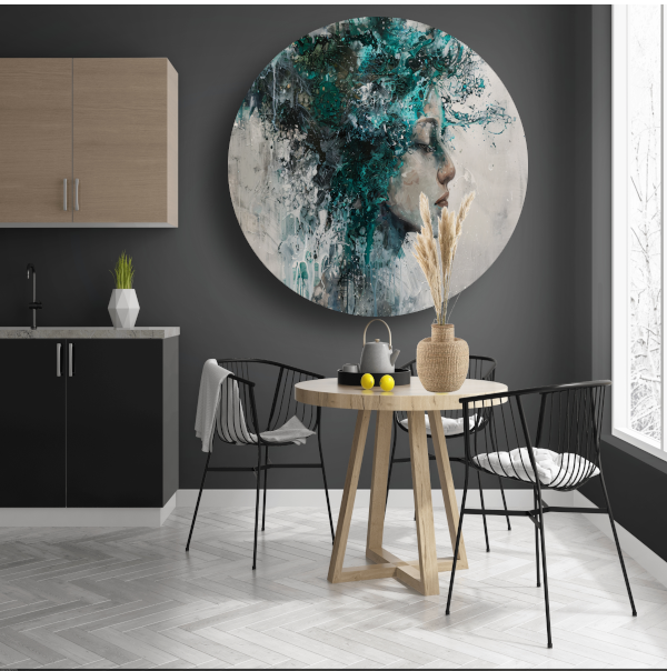 Geef je interieur een upgrade met dit Abstract Profiel van een Vrouw in Turquoise aluminium muurcirkel en creëer een stijlvolle en eigentijdse sfeer in huis.