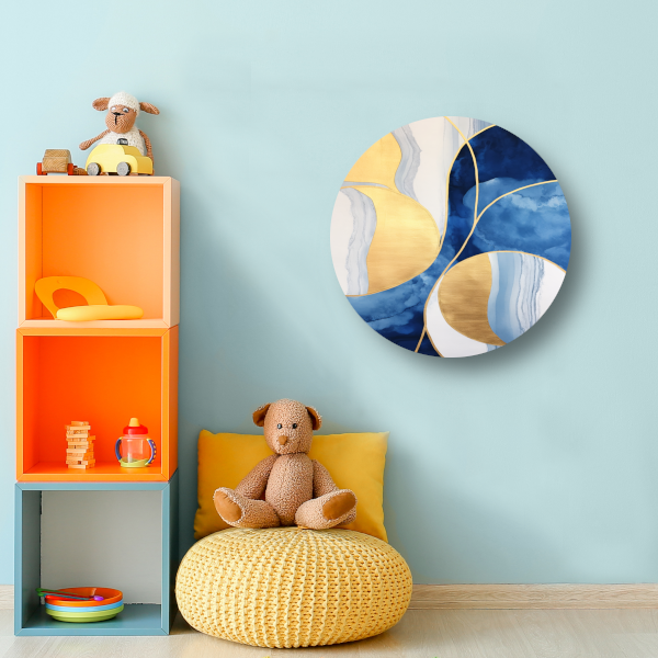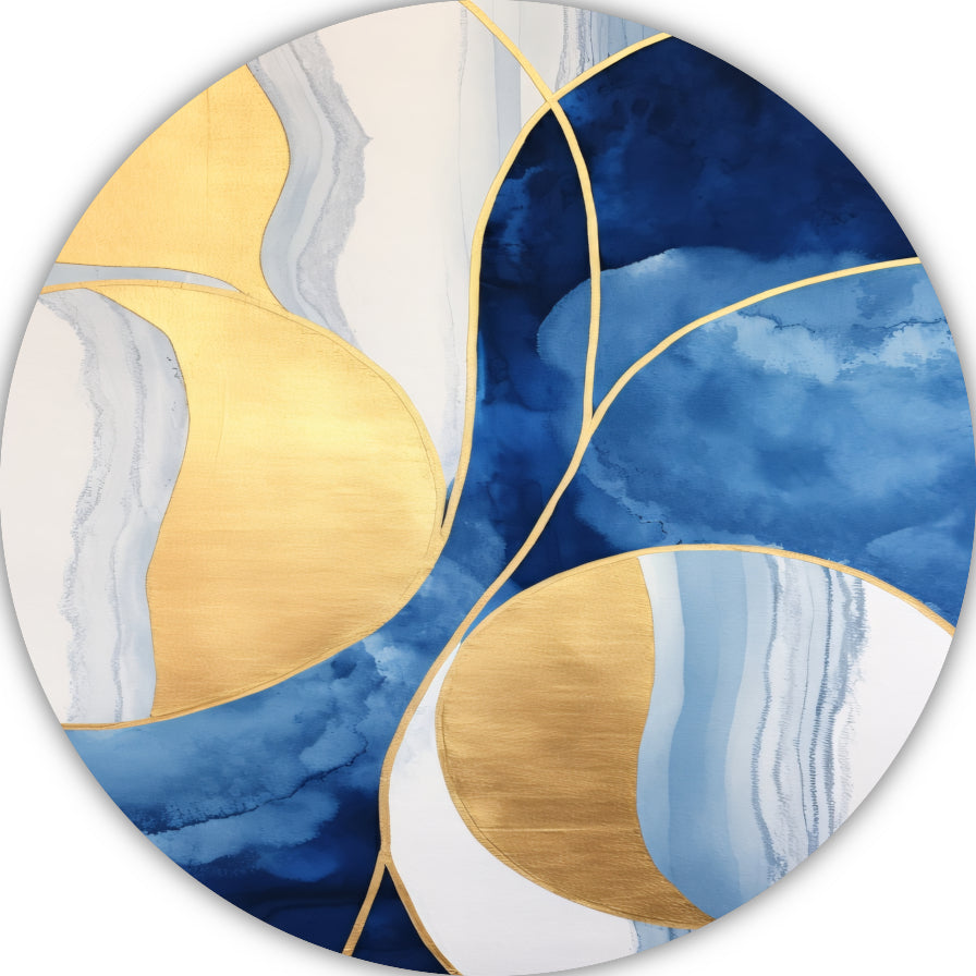 Abstract schilderij in blauw, wit en goud aluminium muurcirkel