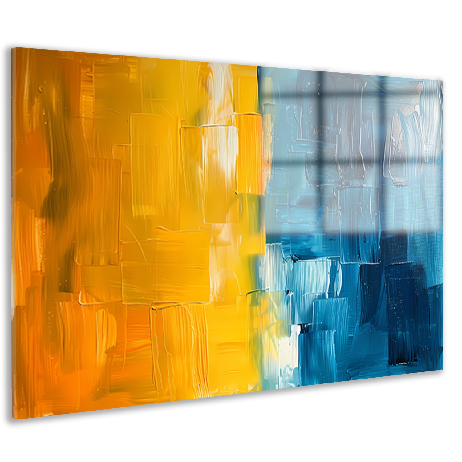 Abstract schilderij met geel en blauw acrylglas