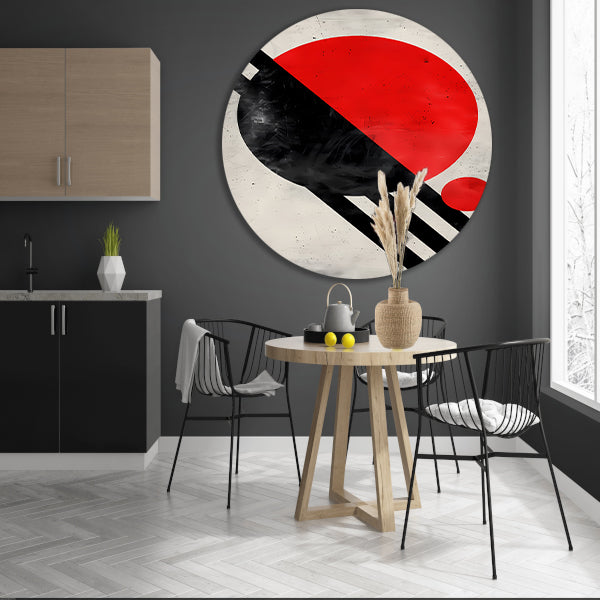 Abstract schilderij met rode cirkel en zwarte lijnen. aluminium muurcirkel