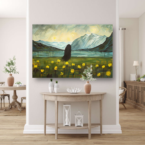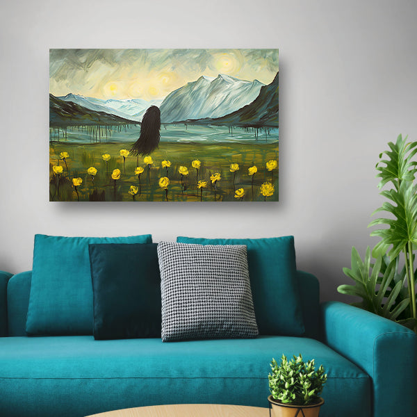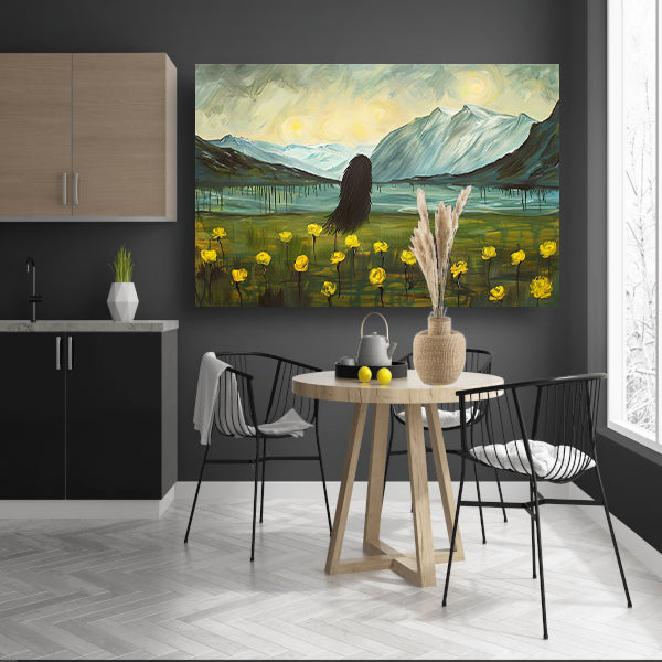Abstract schilderij van berglandschap met bloemen acrylglas