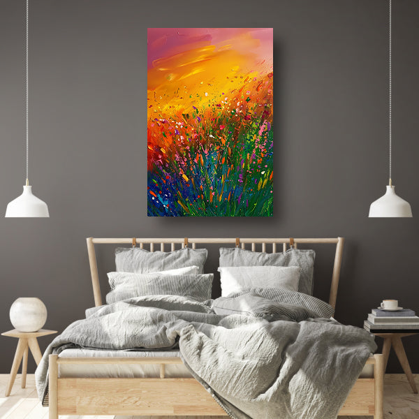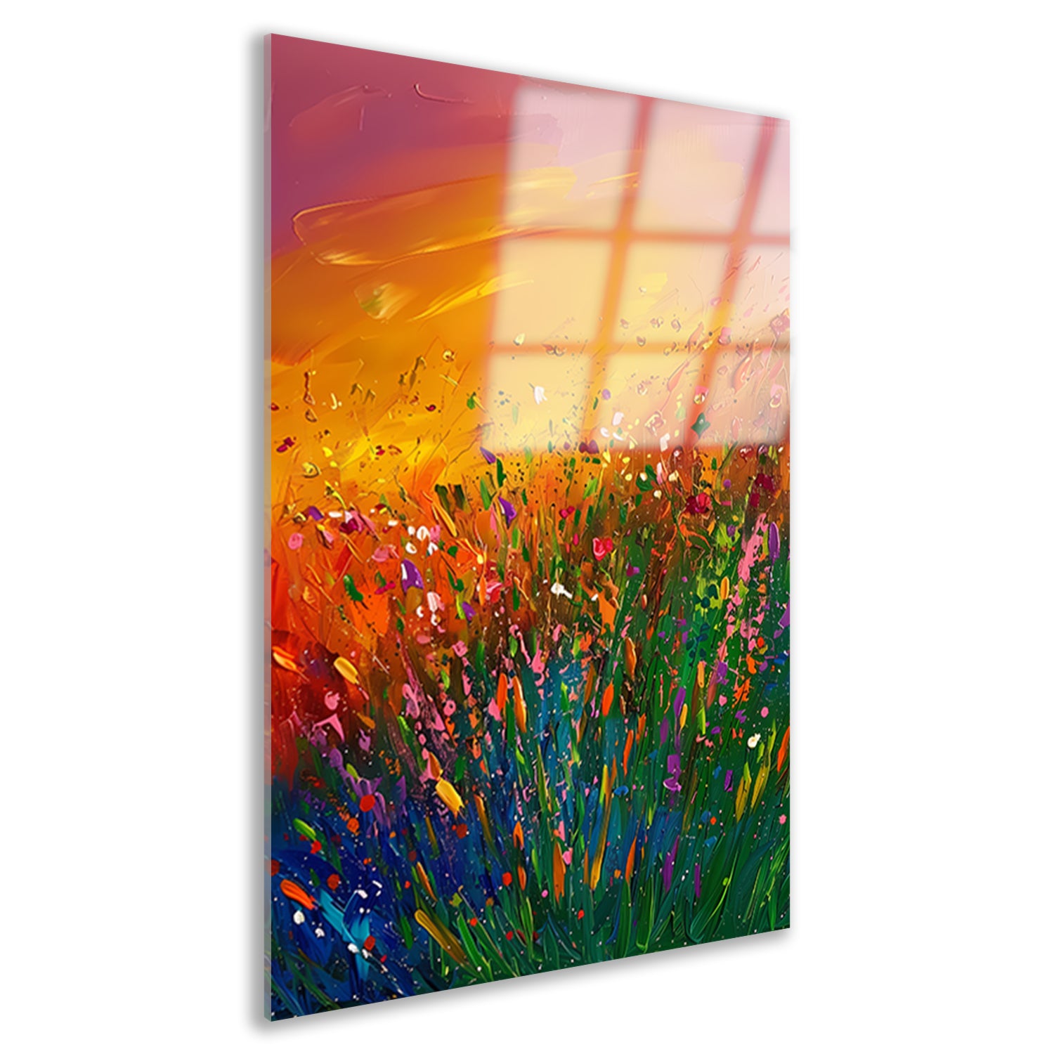 Abstract schilderij van bloemenveld bij zonsondergang acrylglas