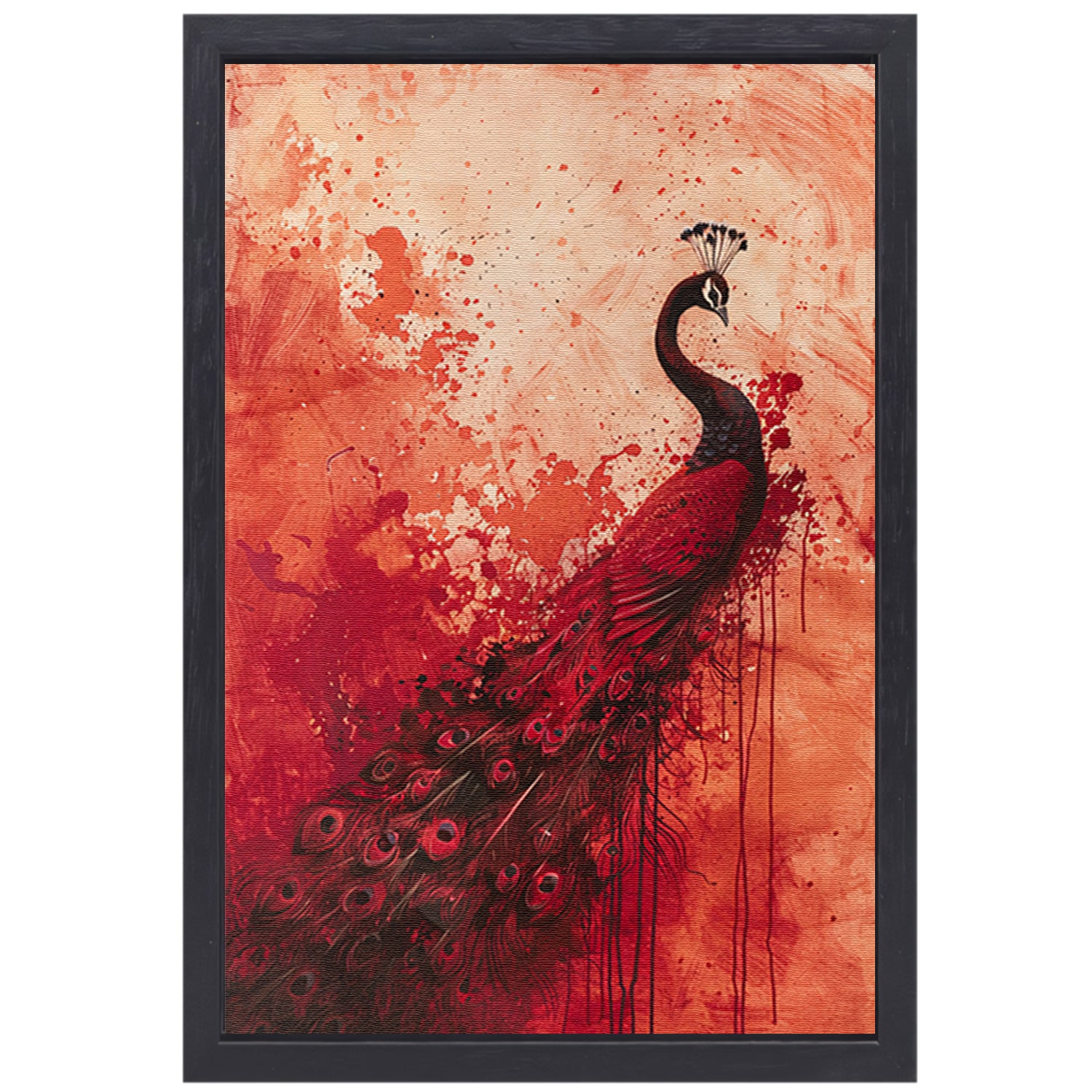 Abstract schilderij van een pauw met verfspatten canvas met baklijst