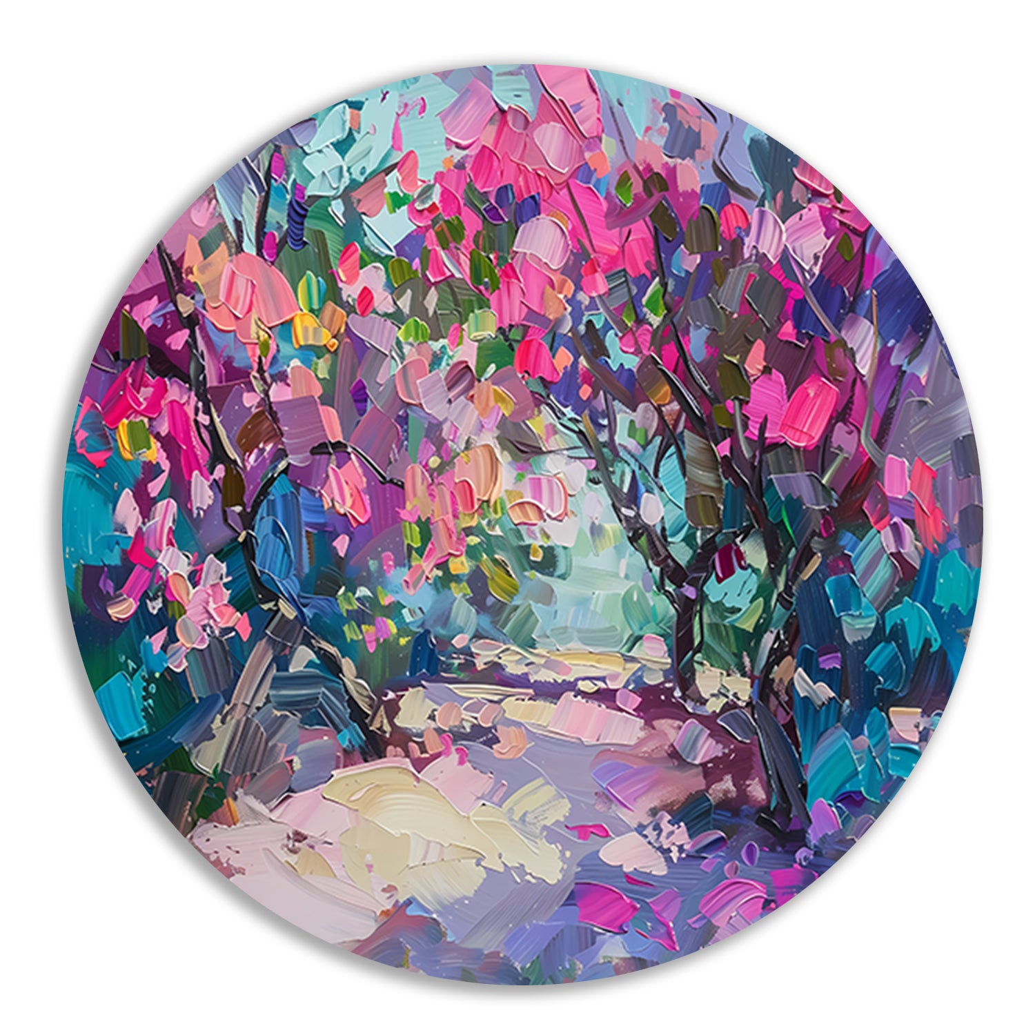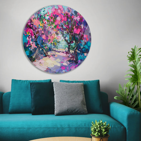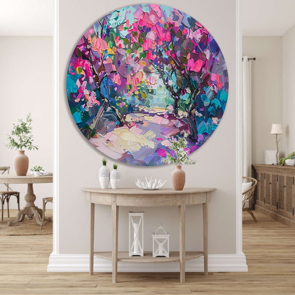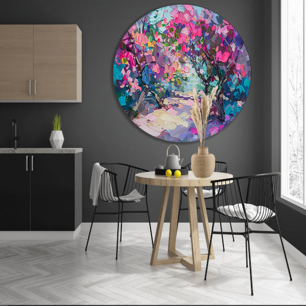 Abstract schilderij van kleurrijke bloemen en bomen aluminium muurcirkel
