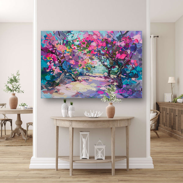Abstract schilderij van kleurrijke bloemen en bomen canvas met baklijst