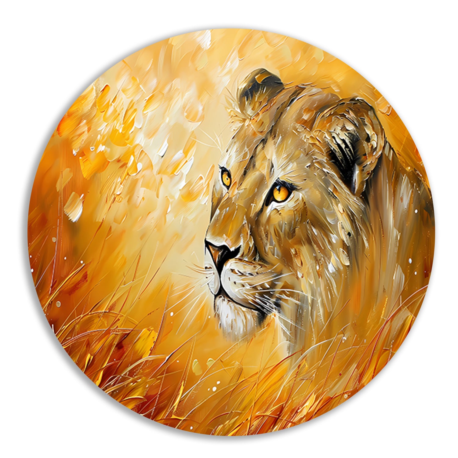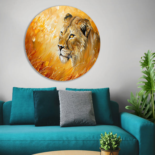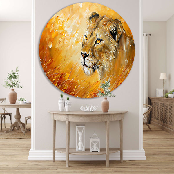 Abstract schilderij van leeuw in kleurrijk gras forex muurcirkel