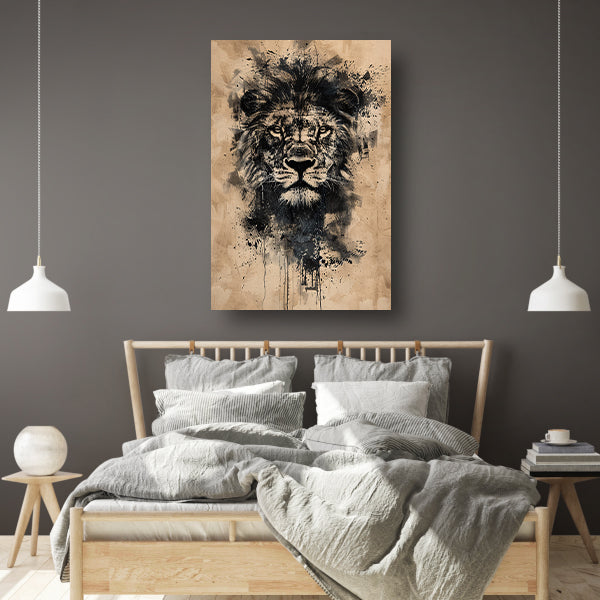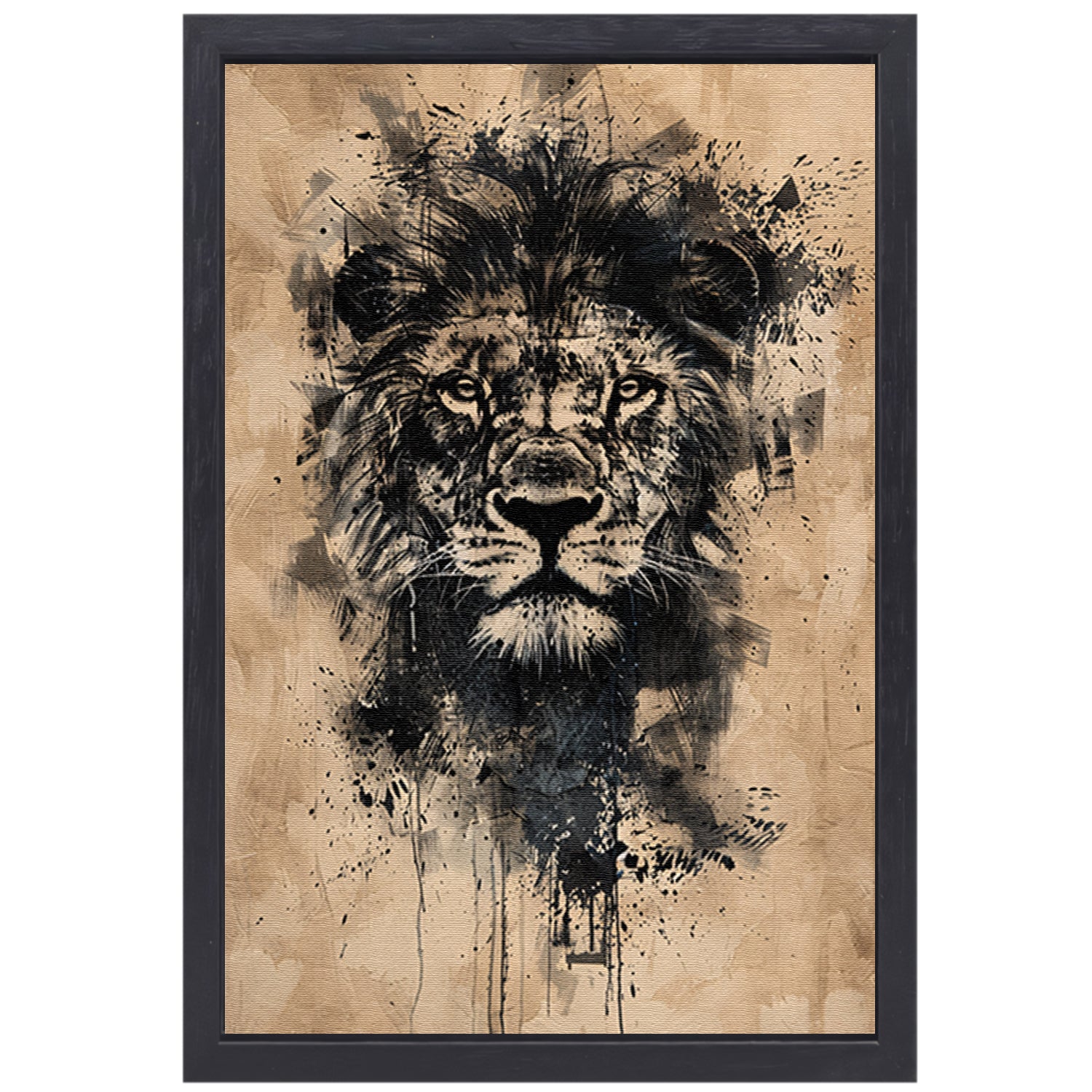 Abstract zwart-wit leeuwenportret met verfspetters canvas met baklijst
