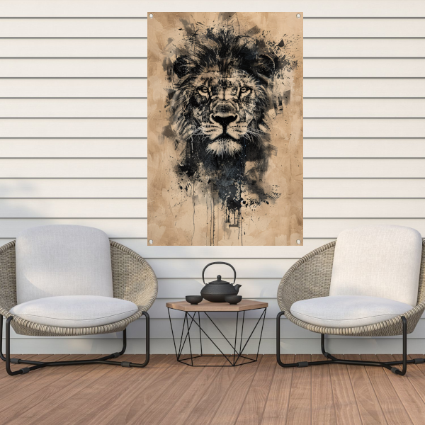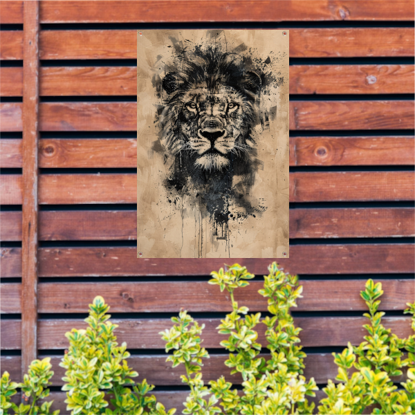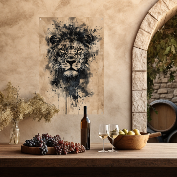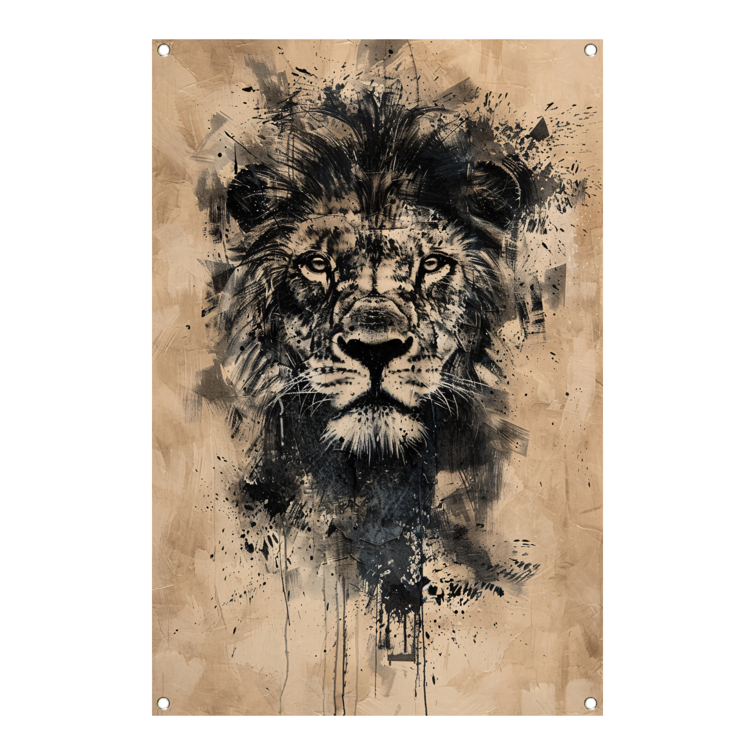 Abstract zwart-wit leeuwenportret met verfspetters tuinposter