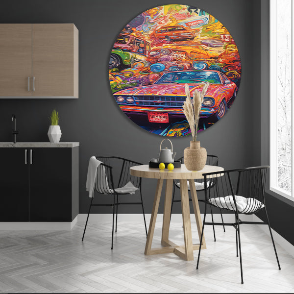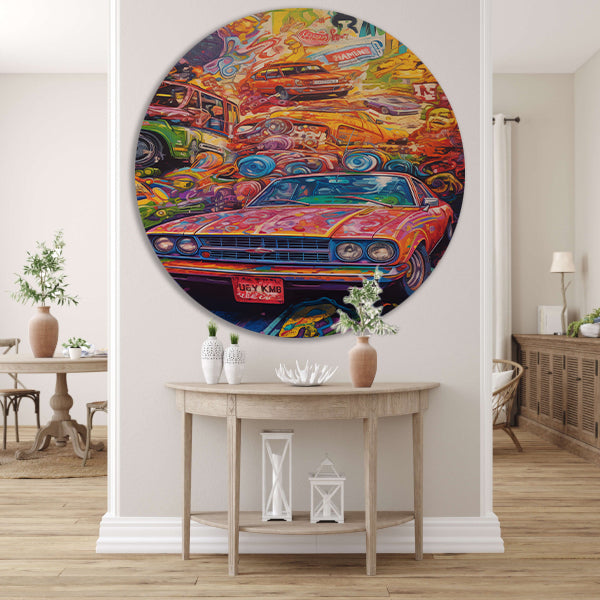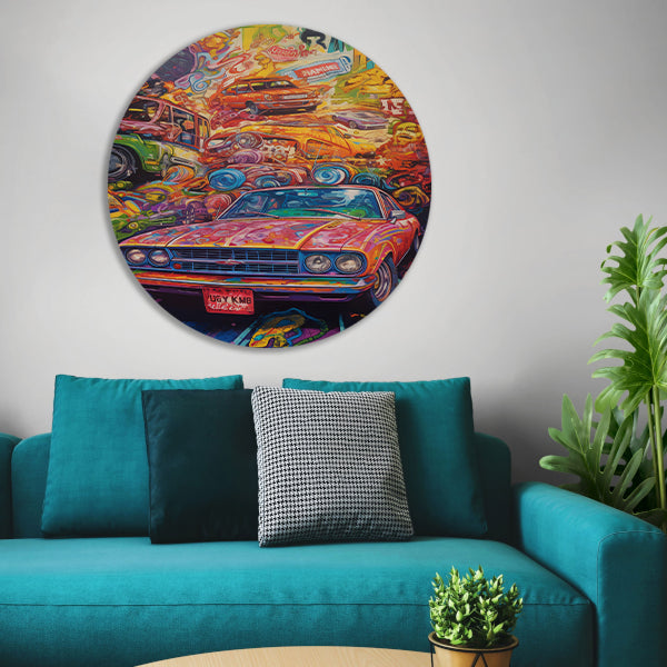 Abstracte auto in kleurrijk landschap aluminium muurcirkel