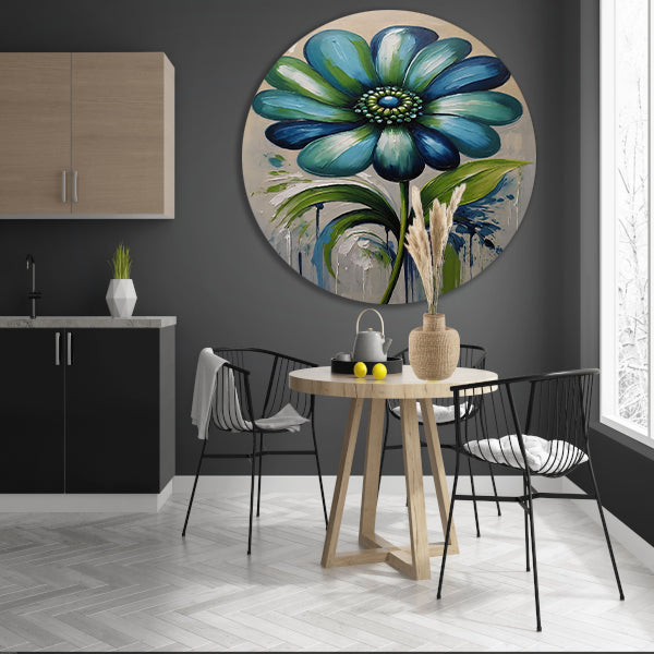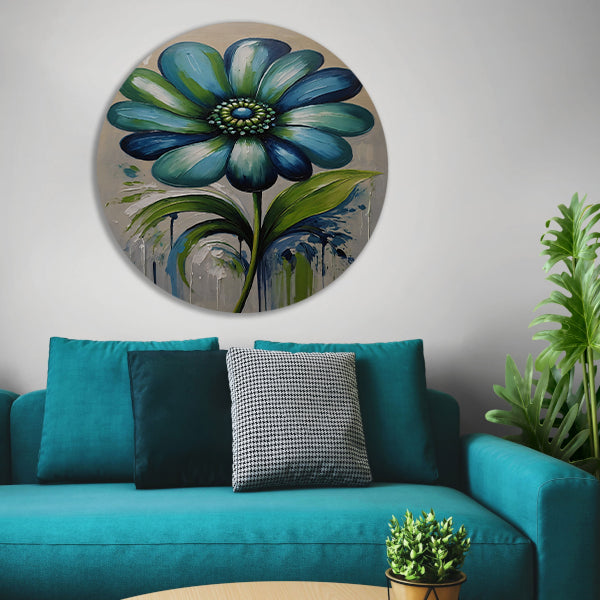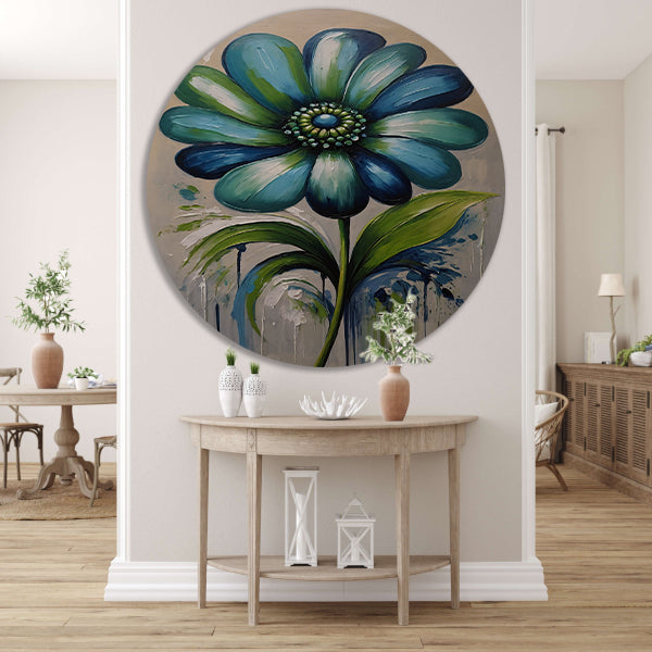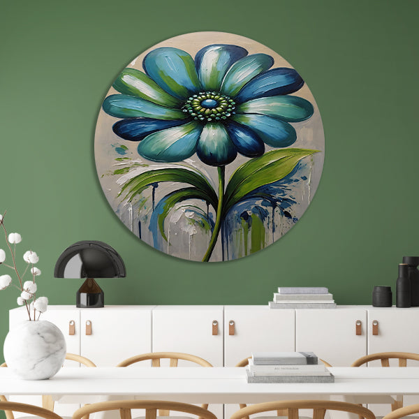 Abstracte Blauwe Bloem met Groene Bladeren aluminium muurcirkel