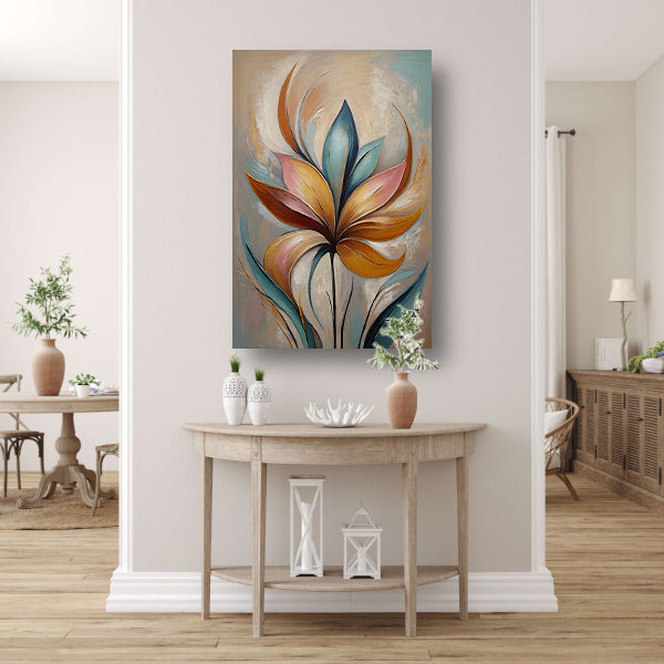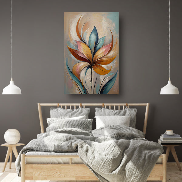 Dit kunstwerk is verkrijgbaar in meerdere formaten, waardoor er altijd een geschikt formaat is voor jouw ruimte. Of je nu op zoek bent naar een opvallend statement piece of een subtiele toevoeging aan je interieur, deze abstracte bloem is de perfecte keuze.