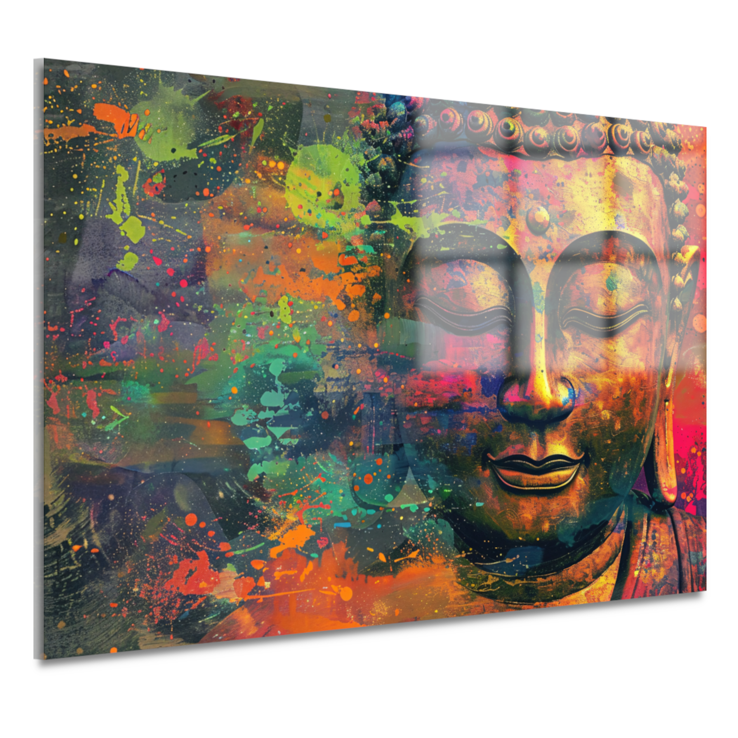 De afbeelding van Boeddha is abstract weergegeven in een kleurenpallet van levendige tinten die zorgen voor een visueel spektakel. De details en nuances van de afbeelding komen prachtig naar voren op het hoogwaardige acrylglas.
