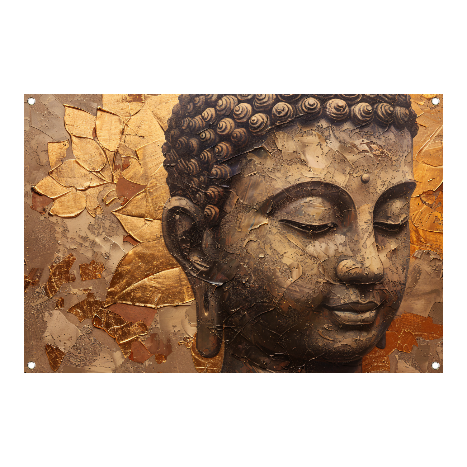 Abstracte Boeddha met serene blik en gouden bladeren tuinposter