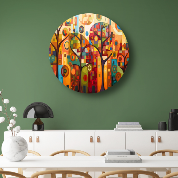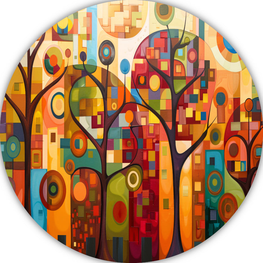 Abstracte bomen in stedelijke kleurenpracht aluminium muurcirkel