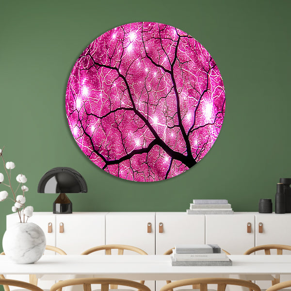 De afbeelding van de abstracte boom met fel lichtstralen geeft een speelse en kunstzinnige touch aan elke ruimte. Of je nu van strak en minimalistisch houdt of juist van een meer eclectische stijl, deze muurcirkel past perfect in elk interieur.